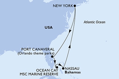 Маршрут круиза: Нью-Йорк - море - Порт Канаверал - о. Оушен Кей - Нассау - море - море - Нью-Йорк
