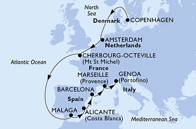 Маршрут круиза: Копенгаген - море - Амстердам - море - Шербур - море - море - Малага - Аликанте - Барселона - Марсель